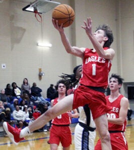 Vance Kelley goes airborne during a dazzling drive to the hoop for two. Kelley ended the night with nine points for the Eagles.