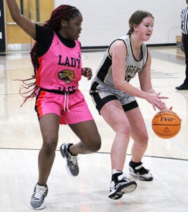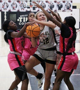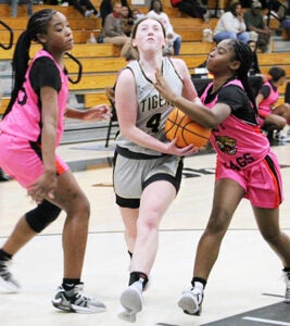 Blakeley Smith fends off several Lady Jaguars during a drive to the basket. Smith earned seven points in the Lady Tigers’ win.