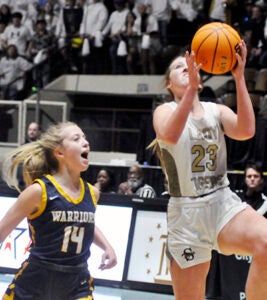 Straughn’s Allyx Williamson makes a move to the basket as Cottage Hill’s Sydney Roossinck pursues on defense. Williamson led the Lady Tigers with 16 points.