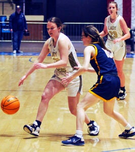 Tori Canant brings the ball down the court for the Lady Tigers as Ashlyn Newton keeps up on defense for the Lady Warriors.