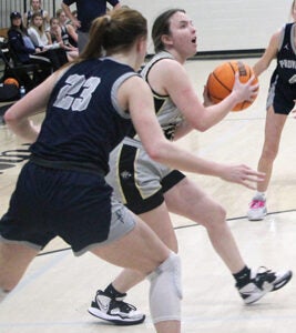 Bryleigh McBride attempts a three-pointer for the Lady Tigers as Laura Faulk defends the shot for the Lady Eagles. McBride finished with nine points in the game and had three of the team’s 10 three-pointers.