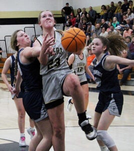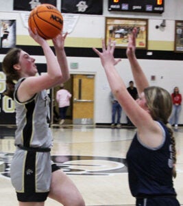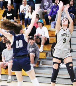Bryleigh McBride attempts a three-pointer for the Lady Tigers as Laura Faulk defends the shot for the Lady Eagles. McBride finished with nine points in the game and had three of the team’s 10 three-pointers.