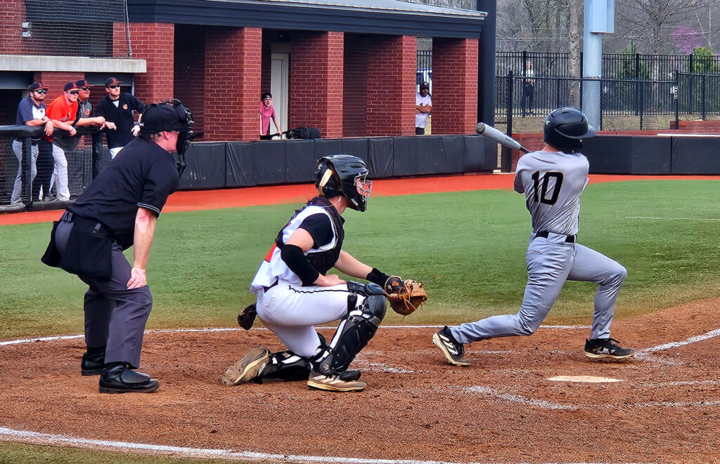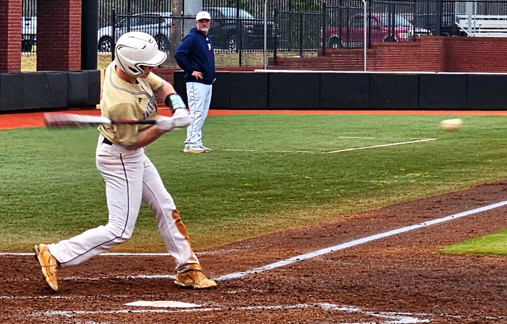 Jacksonville’s Matthew Parker follows through on a pitch against Donoho during Thursday’s Spring Experience action at Choccolocco Park. (Photo by Joe Medley)