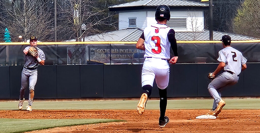 Oxford’s Nick Richardson takes off down the first-base line after connecting on a pitch against Alexandria on Thursday at Choccolocco Park. (Photo by Joe Medley)