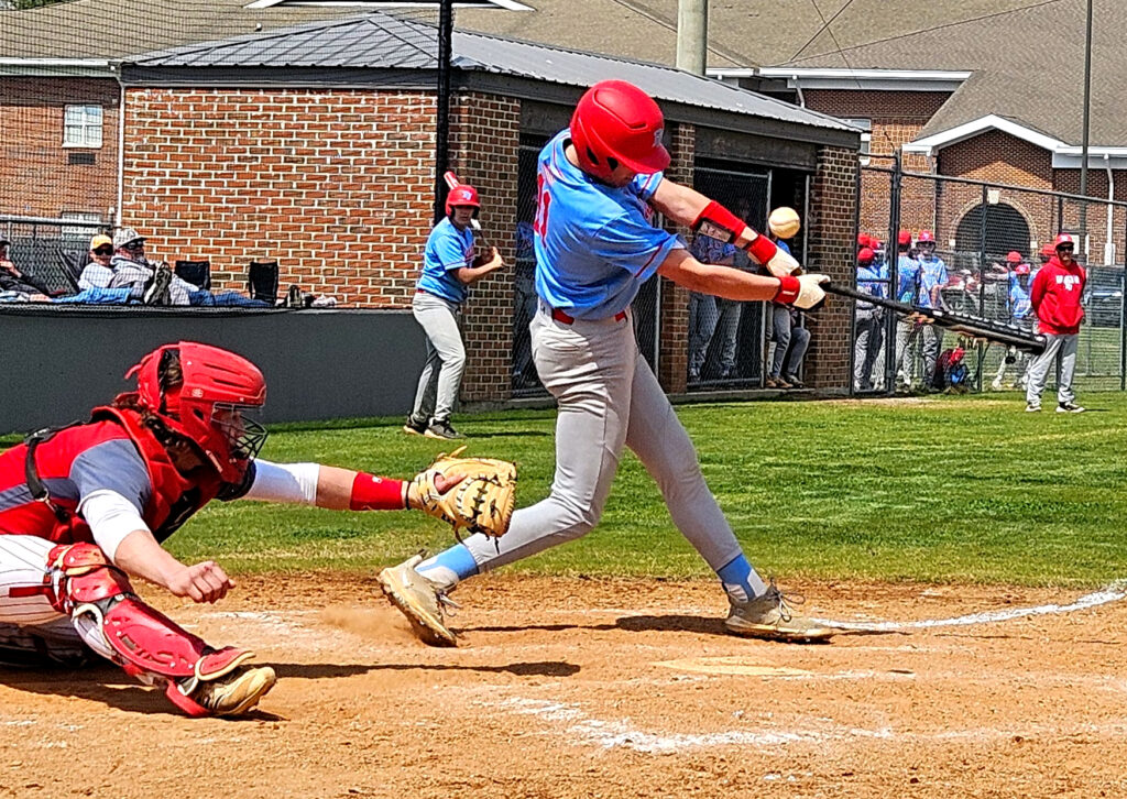 Ohatchee’s Jesse Baswell follows through on his game-tying double in the bottom of the seventh inning against Pleasant Valley on Saturday. (Photo by Joe Medley)