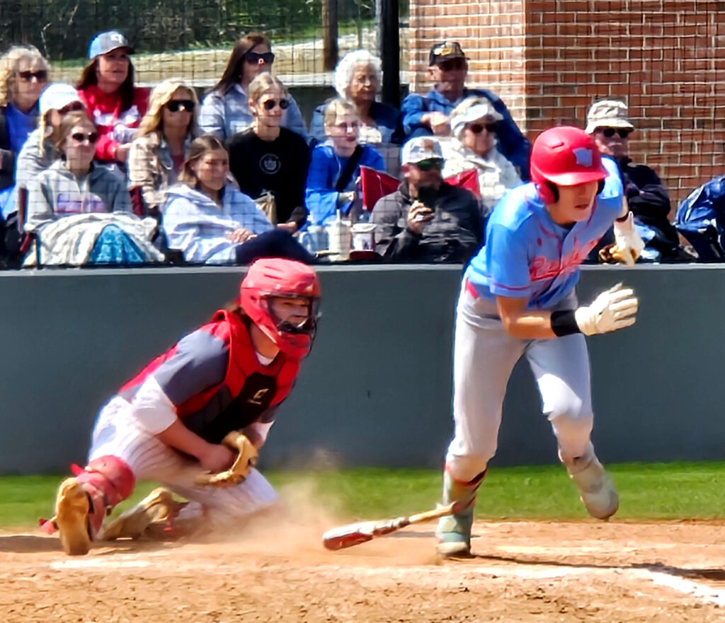 Pleasant Valley’s Holt Bentley takes off for first base after putting the ball in play for a two-run error that gave the Raiders a 4-3 lead in the top of the seventh inning Saturday at Ohatchee.
