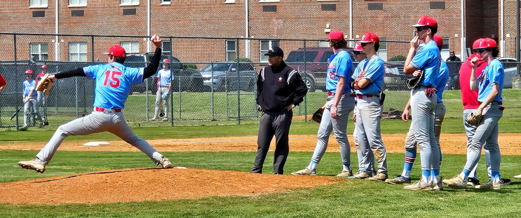 Teammates and an umpire watch as Pleasant Valley reliever Bryce Freeman warms up in the seventh inning Saturday at Ohatchee.