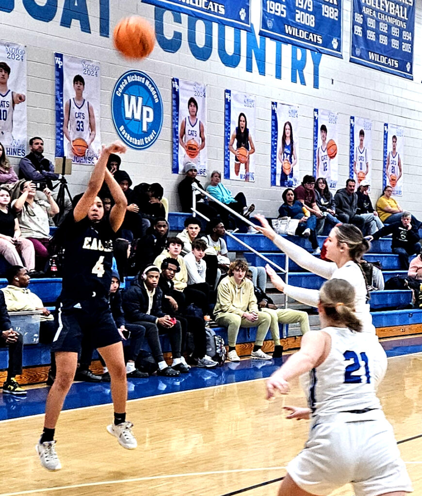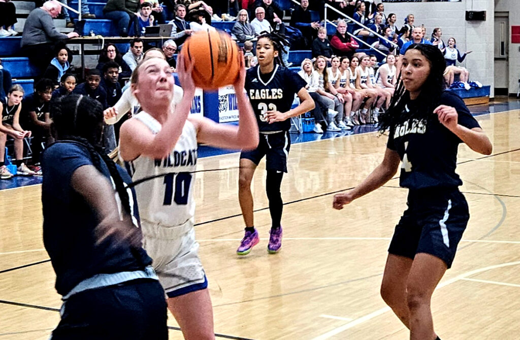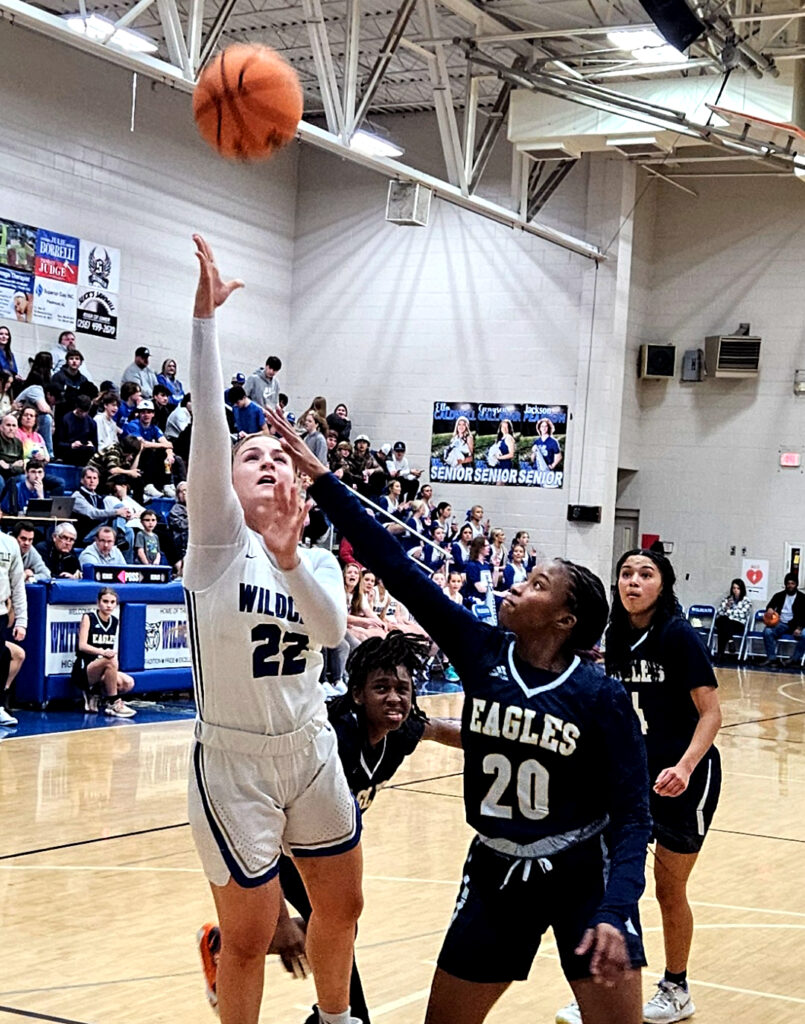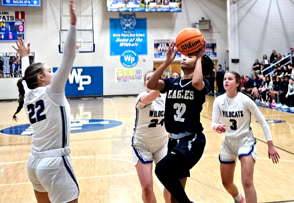 White Plains’ Addi Bradley goes up for two as Jacksonville’s Ontarriah Braxton (20) defends and Jayci Taylor (middle) and Alexis Phillips trail the play Monday at White Plains.