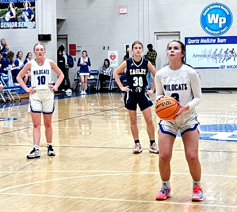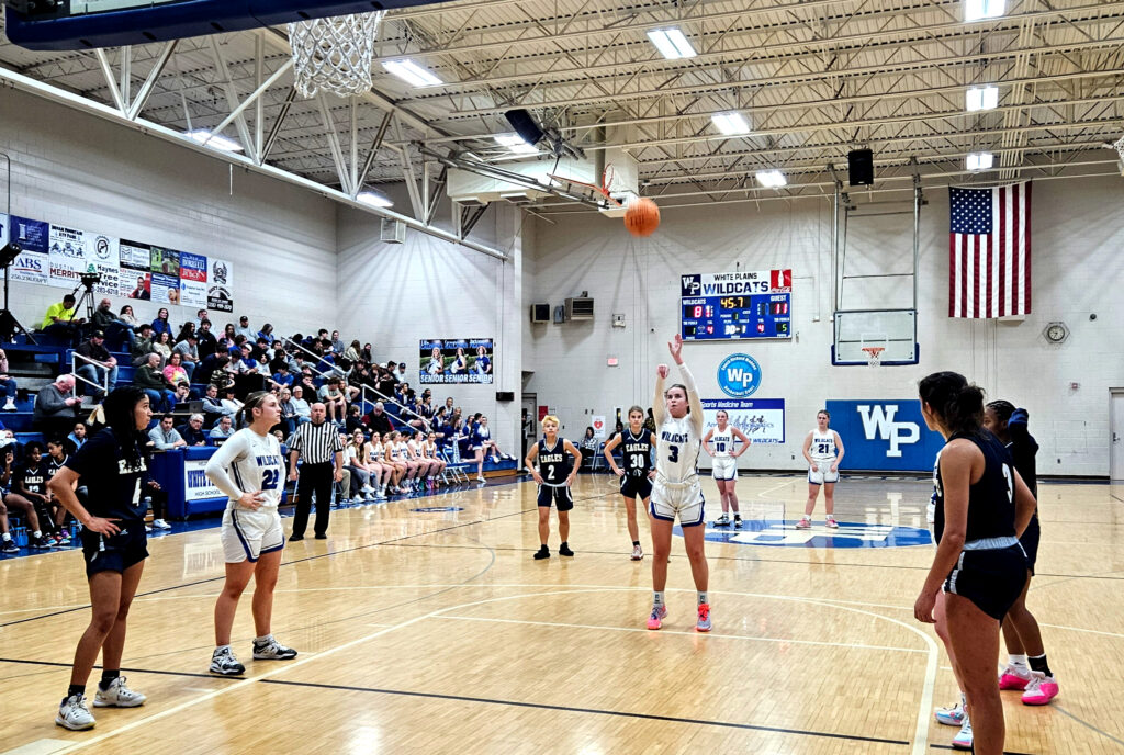 White Plains’ Cooper Martin eyes a free throw as teammate Abbie Dickeson (10) and Jacksonville’s Emerson Weaver look on Monday at White Plains.