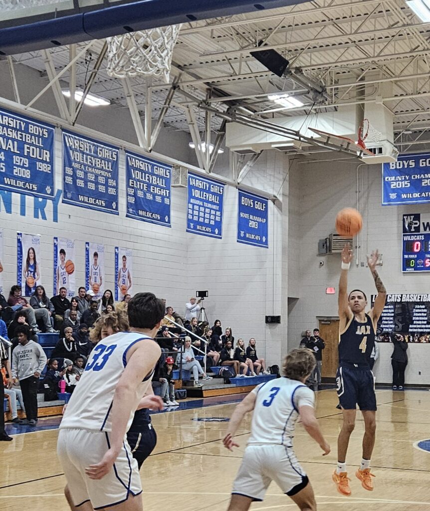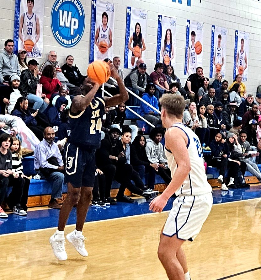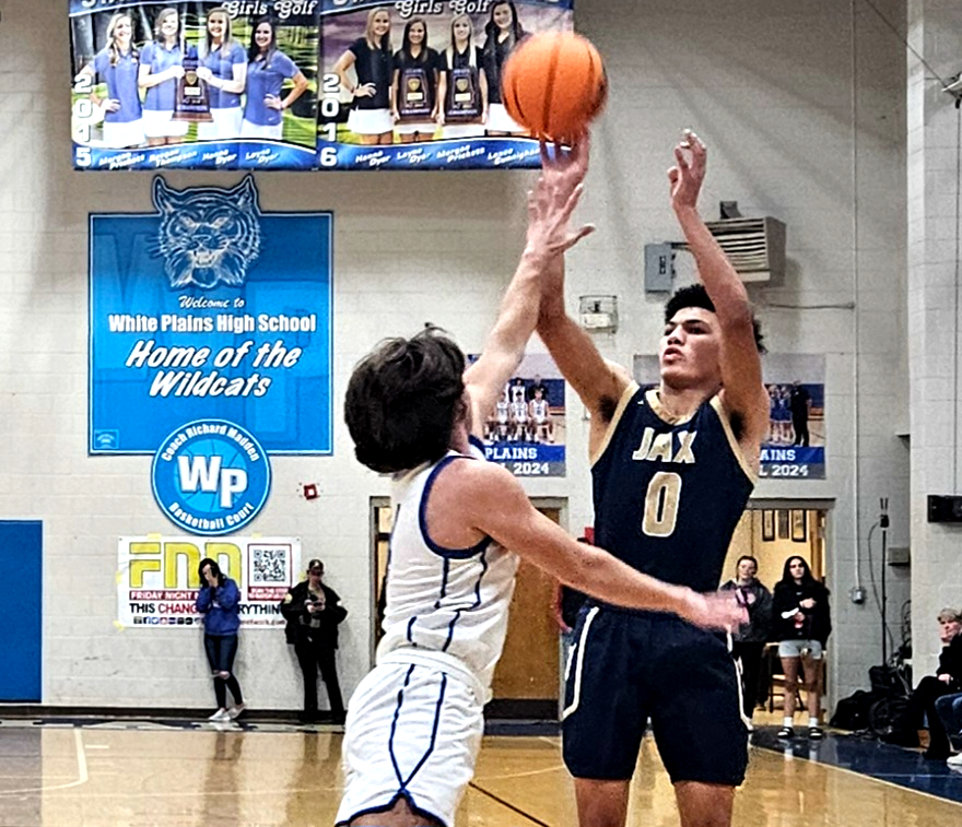 Jacksonville’s Ky’dric Fisher shoots a 3-pointer as White Plains’ Daniel Williams defends Monday at White Plains.