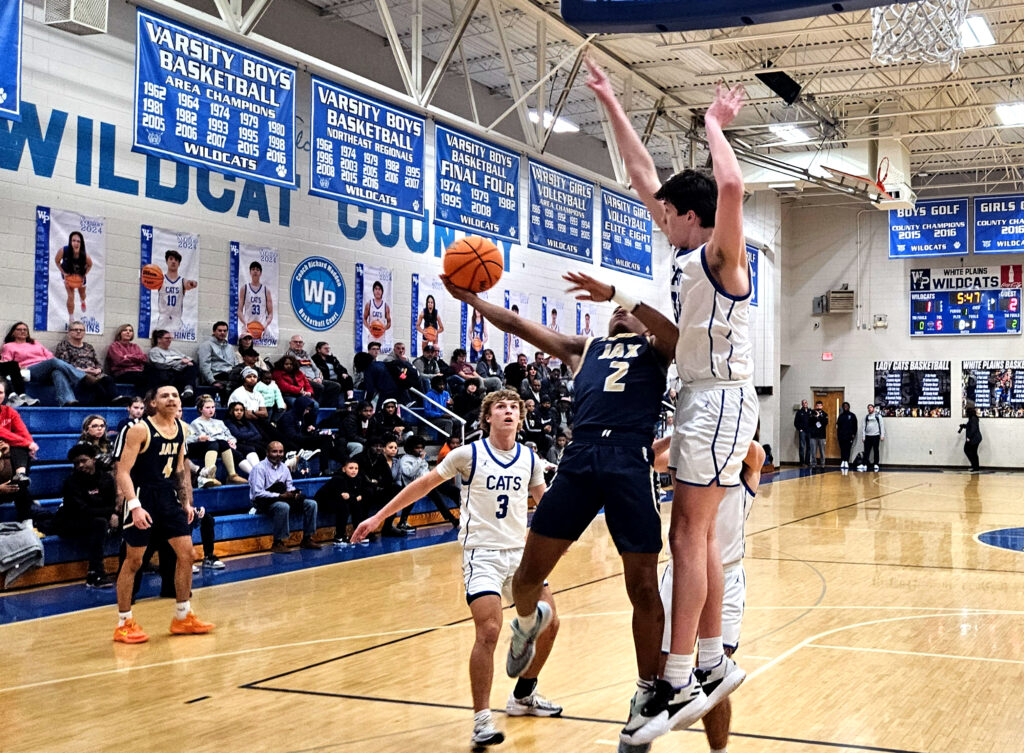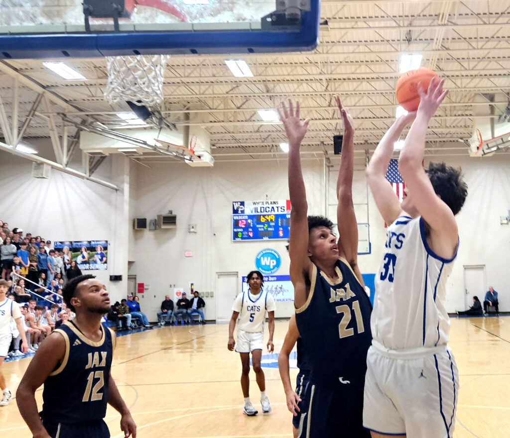 White Plains’ Cam Almon goes up for two as teammate Daniel Williams (21) plus Jacksonville’s Imoree Young (left) and Jaquan Ervin defend Monday at White Plains.