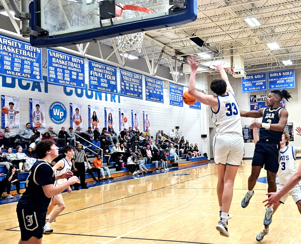 White Plains’ Carter Johnson (33) goes up for two as Jacksonville’s Sean Herbert (21) and Damonte Sinclair (12) defend Monday at White Plains. White Plains’ Cam Almon trails the play.