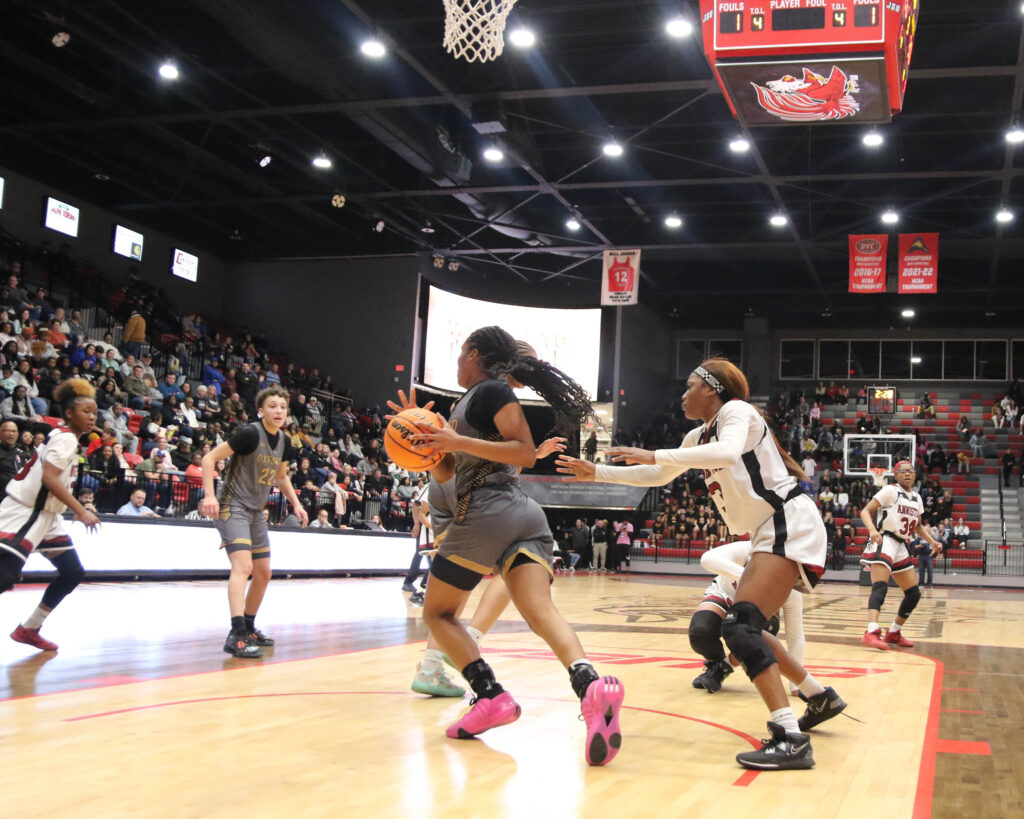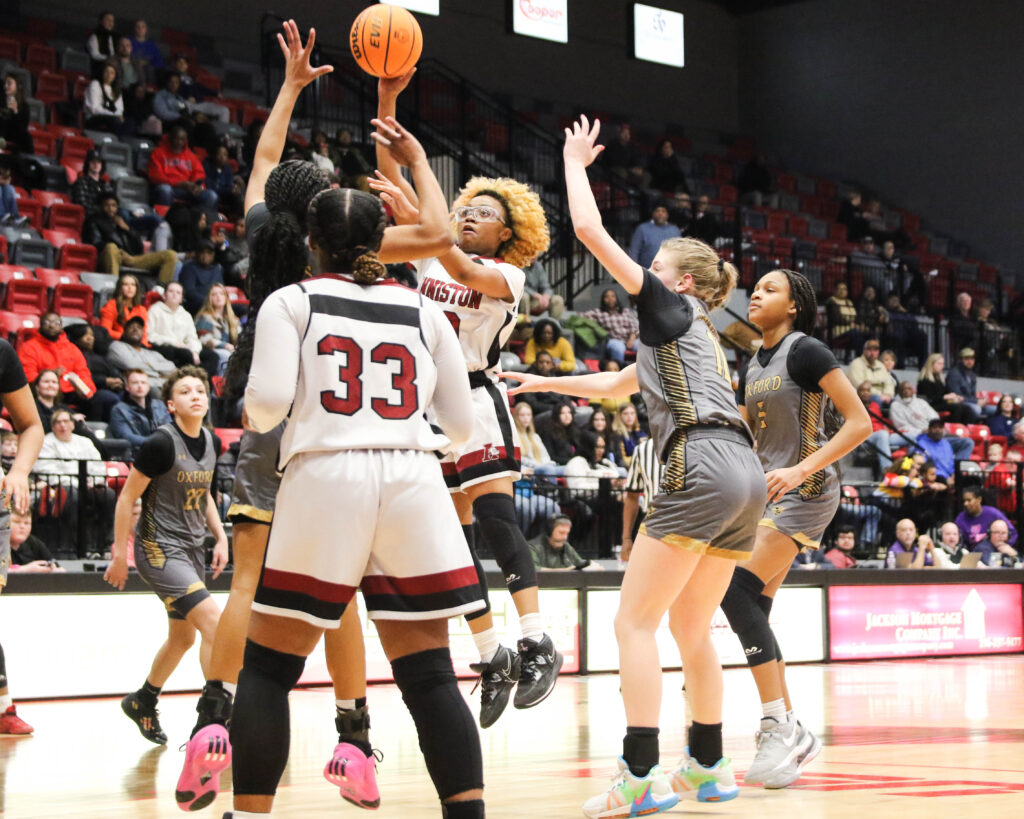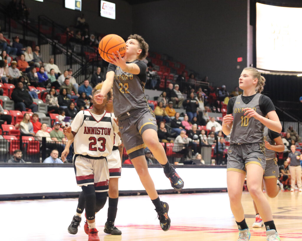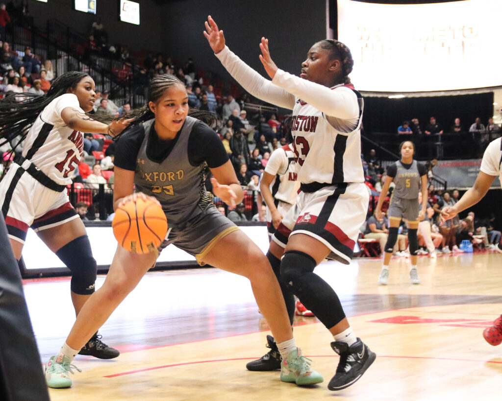 Cover photo: Oxford’s Shay Montgomery drives as Anniston’s Tykeria Smith (33) and Saniyah Spinks defend during Friday’s Calhoun County girls’ championship game in Pete Mathews Coliseum.