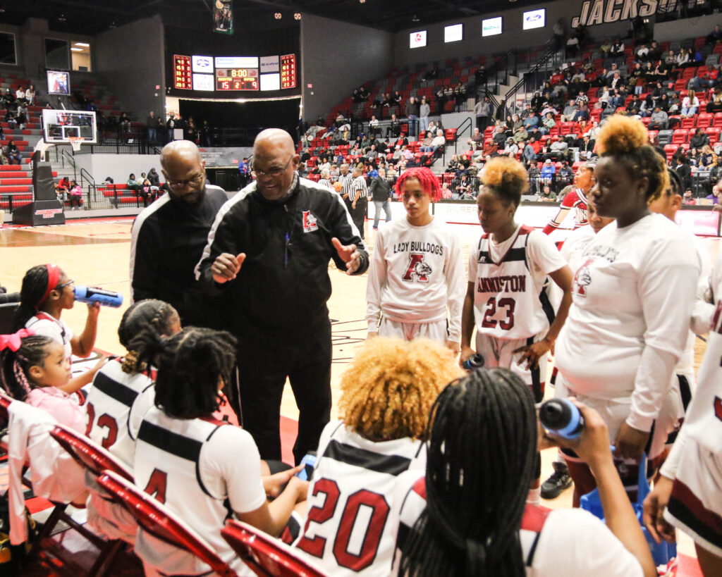 Anniston coach Eddie Bullock talks during a timeout in Friday’s Calhoun County girls’ championship game in Pete Mathews Coliseum.