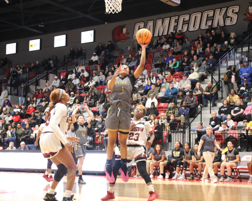 Oxford’s Xai Whitfield goes up for two as Anniston’s Layla Tyus (left), teammate Bri Wilson (center), Anniston’s Serena Hardy (23) and Oxford coach Melissa Bennett look on during Friday’s Calhoun County girls’ championship game in Pete Mathews Coliseum.