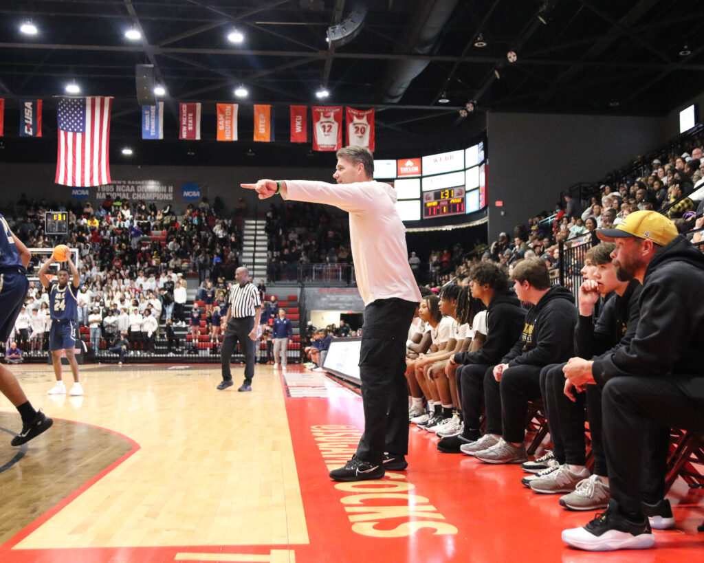 Oxford coach Joel Van Meter points the way during Friday’s Calhoun County boys’ championship game in Pete Mathews Coliseum.