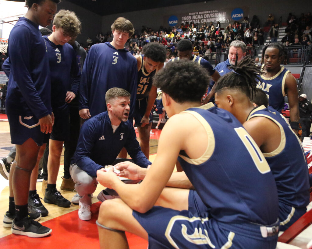Jacksonville coach Tres Buzan talks during a timeout in Friday’s Calhoun County boys’ championship game in Pete Mathews Coliseum.