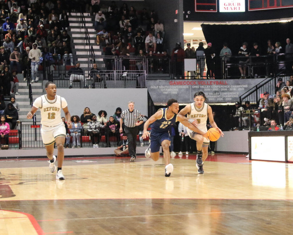 Oxford’s Jaylen Alexander dribbles as Jacksonville’s Damonte Sinclair defends during Friday’s Calhoun County boys’ championship game in Pete Mathews Coliseum. Oxford’s Jayden Lewis looks on.