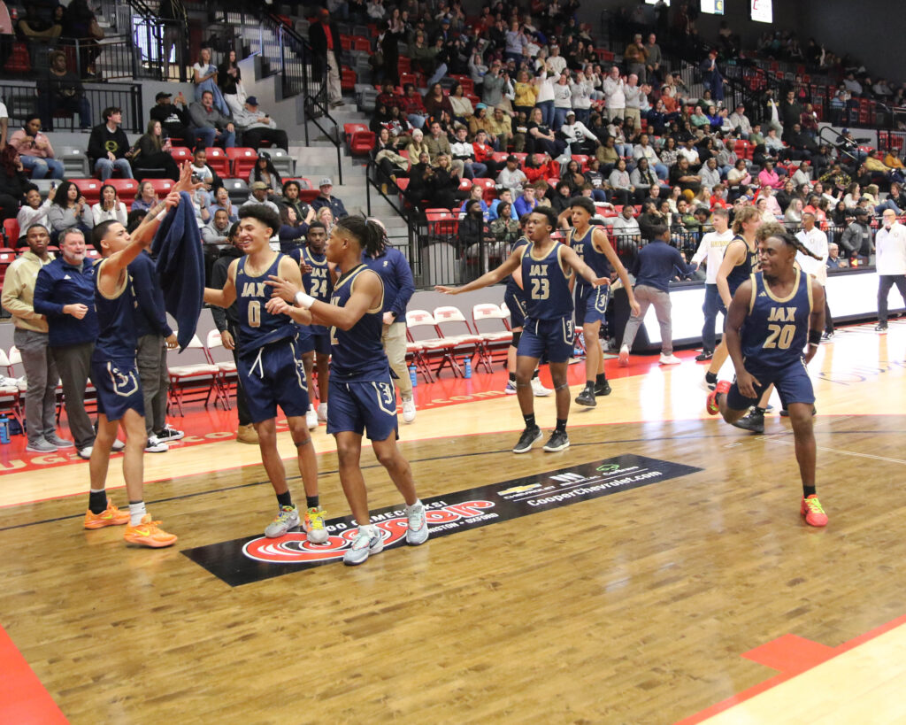 Jacksonville players celebrate after winning Friday’s Calhoun County boys’ championship game in Pete Mathews Coliseum.