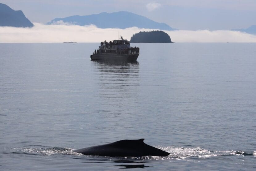 A whale surfaces near an Alaska Tales Whale Watching boat in early September 2023. (Clarise Larson/KTOO)