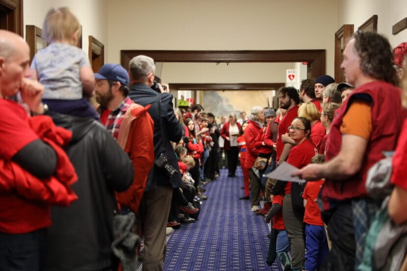 Dozens of Juneau educators and residents flooded the Alaska Capitol Monday afternoon in hopes of convincing legislators to support an override to Gov. Mike Dunleavy’s veto of millions in state education funding.
