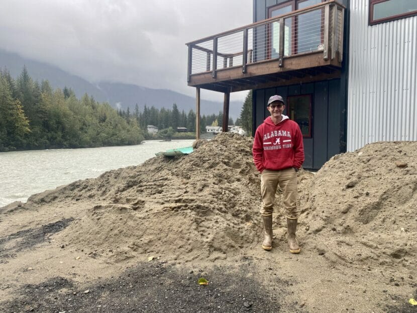 All along the Mendenhall River, restoration work has begun. A crew of river rafters clear downed trees from the water below Ballard’s balcony. And on the opposite bank, a truck dumps massive boulders that pile up on the river’s edge.