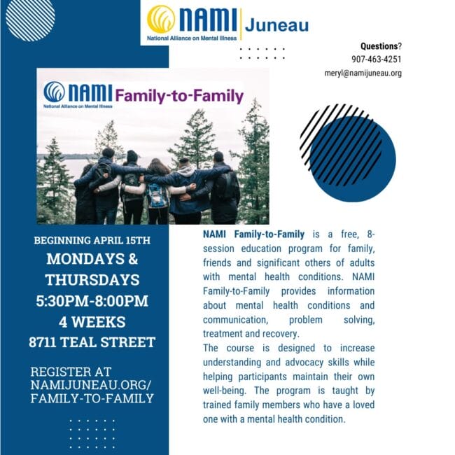 - Classes will be held Mondays and Thursdays, 5:30 p.m. – 8:00 p.m., beginning April 15. They will take place at 8711 Teal Street (Teal Street Center) for four weeks. A simple dinner will be provided. There is no charge for the class. Registration is available at https://www.namijuneau.org/family-to-family or call (907) 463-4251