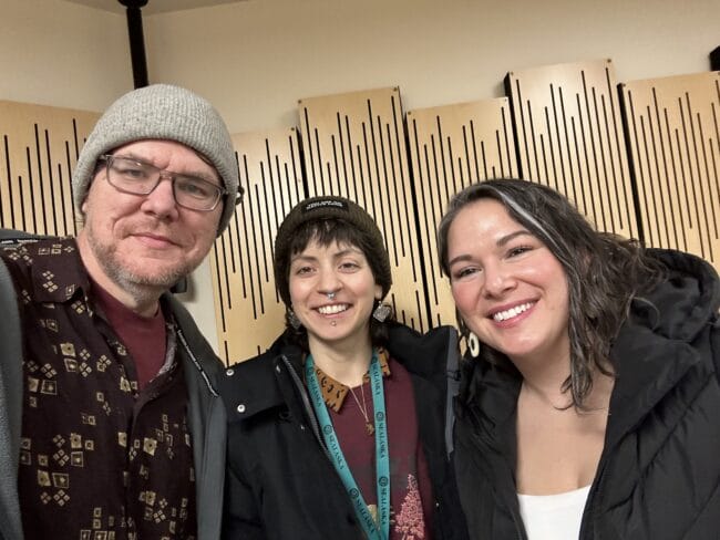 Juneau Afternoon Producer Bostin Christopher, guest T’óok’ Xoo Háni Alicia Maryott and guest host Christina Love (Bostin Christopher/KTOO)