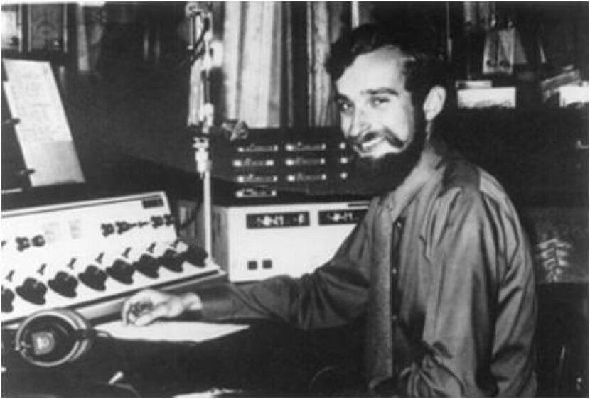 Alex Hills was both an engineer and general manager at KOTZ. He’s pictured here at the controls in the KOTZ studio. KOTZ was the second rural Alaska public station to go on the air, following KYUK in Bethel. (Photo courtesy of Alex Hills)