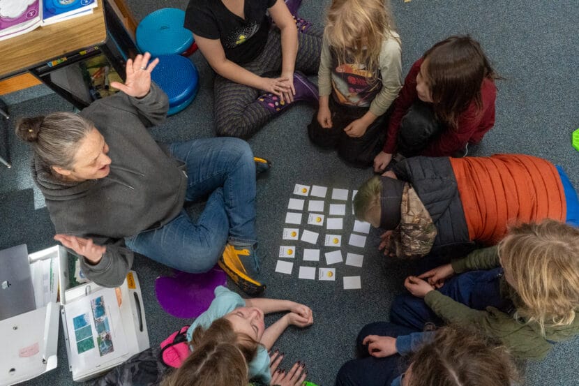 At one session, students sat in a circle on the elementary classroom floor as Hotch laid out flashcards on the carpet for a matching game. Students took turns picking two cards each, with phrases like “xat seiwa.átʼ” (I am cold) or “Ai éet yaan. Uwaháa” (I am hungry) to try to find matches. Afterwards, they gathered in the lunchroom for a quick game of “Yéil, yéil, ch’áak’” (duck duck goose).