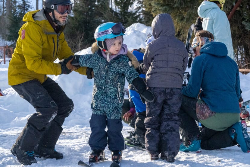 Zephyr Sincerny helps daughter Aven during ski school, which Aven attends twice a week from Haines. (Lex Treinen/Chilkat Valley News)