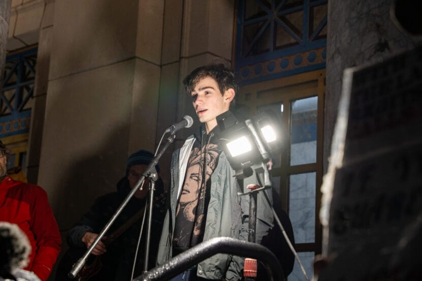 Carson Carrlee, a junior at Juneau Douglas High School: Yadaa.at Kalé, speaks to a crowd at a rally calling for increased state education funding at the Alaska State Capitol on Jan. 29, 2024. (Eric Stone/Alaska Public Media)