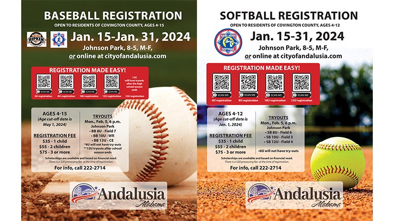 Registration opened this week and continues through Jan. 31 for the City of Andalusia’s baseball and softball leagues. Baseball is open to players ages…