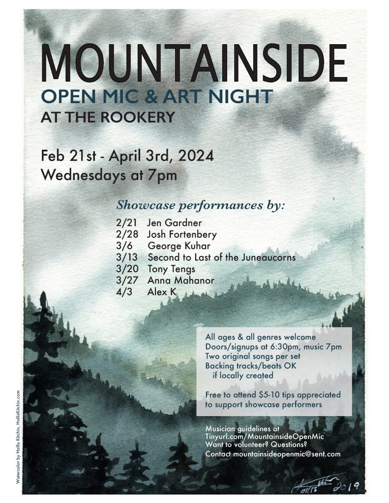 Conversations today include the Juneau Commission on Sustainability’s upcoming Q& A sessions, plus Marian Call and the Mountainside Open Mic begin again February 21….